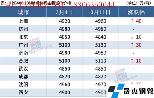 截至3月11日,全國主要城市20mm三級抗震螺紋鋼均價4952元/噸,周環(huán)比上漲6元/噸;8.0mmHPB300高線均價5164元/噸,周環(huán)比上漲3元/噸。