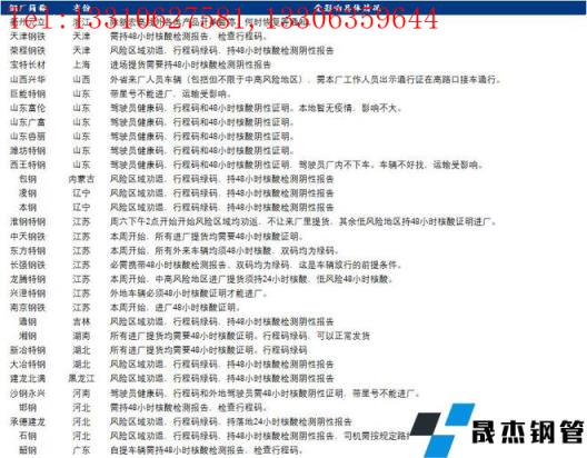 經(jīng)調(diào)研國(guó)內(nèi)多數(shù)優(yōu)特鋼無縫厚壁鋼管廠家物流出貨有受疫情影響,主要在于對(duì)提貨人員著明確規(guī)范要求:各門崗卡口強(qiáng)化查驗(yàn)健康碼、行程卡和48小時(shí)核酸檢測(cè)報(bào)告,并做好人員信息登記。目前受影響各無縫厚壁鋼管廠家詳細(xì)提貨及影響運(yùn)輸要求見下表明細(xì)。后期政策變動(dòng)情況,請(qǐng)具體咨詢當(dāng)?shù)責(zé)o縫厚壁鋼管廠家。
