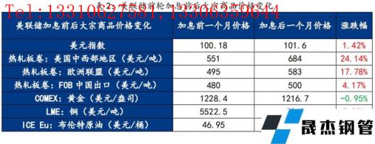 那么,在美聯(lián)儲歷史上進(jìn)行加息的時間區(qū)間中,大宗商品價格都是如何變化的呢?選取了美聯(lián)儲第六輪加息期間(2016.12-2018.12)美元指數(shù)、熱軋板卷、黃金、銅、布倫特原油作為參考標(biāo)的進(jìn)行分析,其中參考時間維度為2016年加息落地前一個月的交易日價格與加息落地后一個月的交易日價格(表2)。