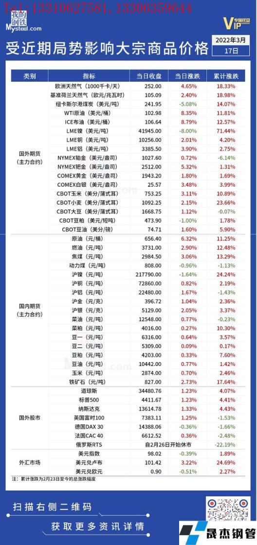 近期,受國際局勢影響,全球金融及大宗商品市場出現(xiàn)較大波動。3月17日,國際油價大幅反彈。匯總情況如下:
