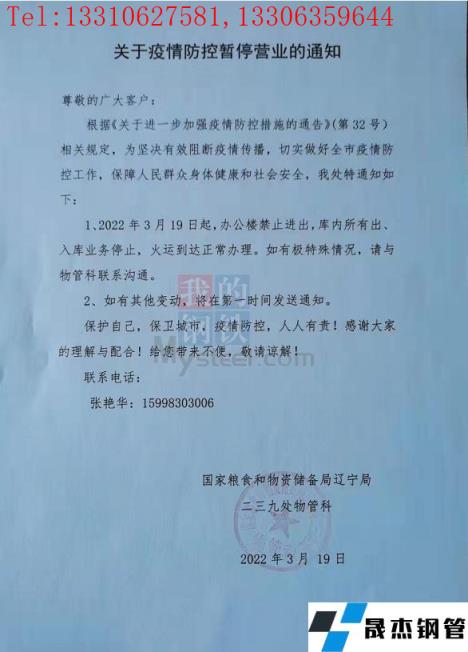 目前沈陽厚壁無縫鋼管中心批發(fā)市場已發(fā)布通告,19日起北一西路東西樓試試封閉管控、嚴(yán)禁人員進入辦公,出庫業(yè)務(wù)暫停、火車到達(dá)正常辦理;中國兵工物資125庫通告19日起嚴(yán)禁人員進入庫區(qū)辦公,出庫業(yè)務(wù)暫停、火車到達(dá)正常辦理;國家糧食和物資儲備局遼寧局二三九處通告19日起辦公樓嚴(yán)禁進出,庫內(nèi)所有出入庫業(yè)務(wù)暫停、火運到達(dá)正常辦理。市內(nèi)其他主要厚壁無縫鋼管市場反饋暫時正常辦公及出庫,但從防控指揮部通告內(nèi)容來看、也有暫停營業(yè)的傾向。(通告見文末圖片)