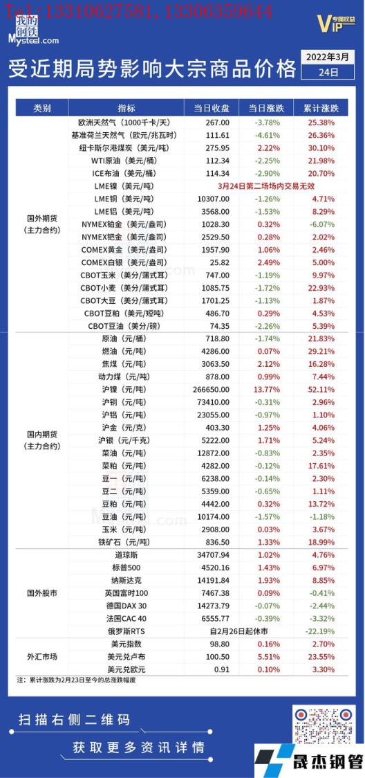 近期,受國際局勢影響,全球金融及大宗商品市場出現(xiàn)較大波動。3月24日,國際油價、能源價格下跌,倫敦金屬交易所(LME)表示,3月24日鎳的第二場場內(nèi)交易將被視為受到干擾,該交易期間達成的所有交易將無效。匯總情況如下: