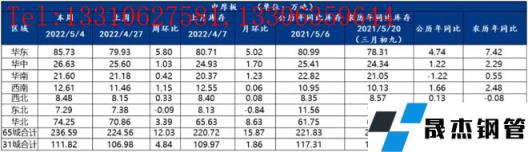 庫存方面:據(jù)統(tǒng)計,建材方面,以螺紋鋼為例,從三大區(qū)域來看,本周華東和南方分別環(huán)比增加8.5萬噸和5.2萬噸,北方環(huán)比減少10.08萬噸;從七大區(qū)域來看,除華北、東北和西北,其余各區(qū)域均有不同程度增加。從城市來看,杭州、南京、南昌、武漢等為主要增庫城市,北京、蘭州、貴陽等為主要降庫城市。其中國內主要城市螺紋鋼、線材總庫存為1096.69萬噸,較上周(2022年4月29日)增加2.18萬噸,增幅為0.20%。同比減少30.10萬噸或減幅為0.20%。