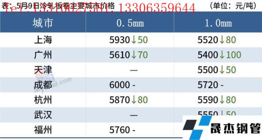 熱軋板卷:5月9日,全國(guó)24個(gè)主要城市4.75mm熱軋板卷均價(jià)5067元/噸,較上個(gè)交易日下跌60元/噸。綜合來看,美聯(lián)儲(chǔ)加息和縮表落地限制了國(guó)內(nèi)貨幣寬松的空間,國(guó)內(nèi)多地區(qū)疫情爆發(fā),國(guó)內(nèi)外的雙重因素導(dǎo)致情緒不佳,無縫厚壁鋼管廠家目前面臨虧損的局面,焦煤焦炭的首輪提降已經(jīng)落地,原料端價(jià)格支撐進(jìn)行弱化,原料與成材呈現(xiàn)負(fù)反饋。預(yù)計(jì)下半年經(jīng)濟(jì)沖擊影響依舊,短期成材或?qū)⒕S持偏弱態(tài)勢(shì)。因此,預(yù)計(jì)全國(guó)熱軋板卷10日價(jià)格維持下行趨勢(shì)。