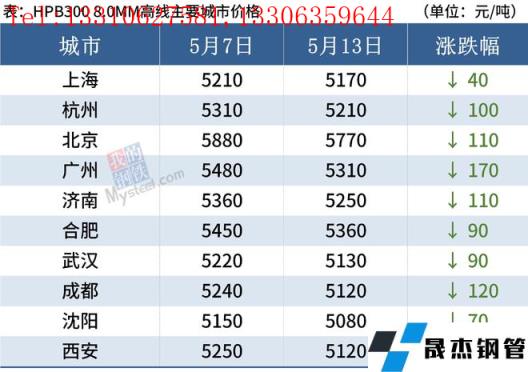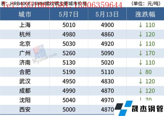 據監(jiān)測,截至5月13日,全國主要城市20mm三級抗震螺紋鋼均價4956元/噸,較5月7日下跌114元/噸;8.0mmHPB300高線均價5205元/噸,較5月7日下跌101元/噸。