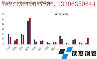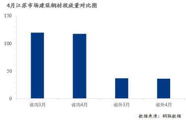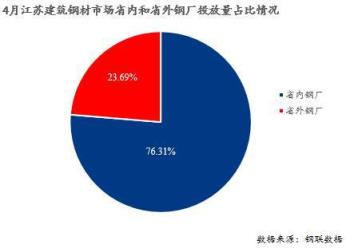 由上圖可見,4月江蘇省內(nèi)無縫厚壁鋼管廠家在江蘇省13個(gè)城市投放建筑厚壁無縫鋼管量占總投放量的76.31%,省外無縫厚壁鋼管廠家占江蘇省總投放量的23.69%。同時(shí),從調(diào)研數(shù)據(jù)來看,4月江蘇市場建筑厚壁無縫鋼管實(shí)際投放總量較3月減少4.36萬噸萬噸,降幅約2.76%。