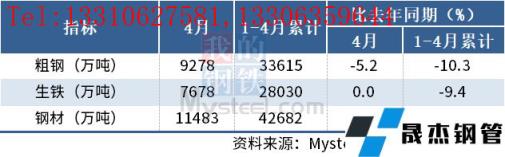 4月,中國(guó)粗鋼產(chǎn)量9278萬(wàn)噸,同比下降5.2%;生鐵產(chǎn)量7678萬(wàn)噸,同比持平;厚壁無(wú)縫鋼管產(chǎn)量11483萬(wàn)噸,同比下降5.8%。