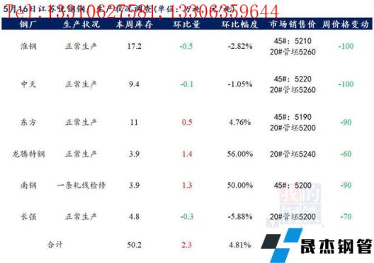 江蘇優(yōu)特?zé)o縫厚壁鋼管廠家棒材總庫存50.2萬噸,較上周增加2.3萬噸,環(huán)比增4.81%,較去年同期增加13.41萬噸,同比增36.45%。