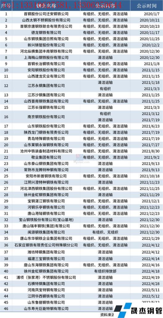 自2020年8月起,中國鋼鐵工業(yè)協(xié)會(huì)開展了鋼鐵企業(yè)超低排放改造和評(píng)估監(jiān)測(cè)進(jìn)展情況公示工作。截至2022年5月13日,已有46家鋼鐵企業(yè)在鋼協(xié)網(wǎng)站進(jìn)行公示。5月以來新增4家企業(yè),分別為河南鳳寶特鋼有限公司、江陰華西鋼鐵有限公司、山東魯麗鋼鐵有限公司和山東壽光巨能特鋼有限公司。