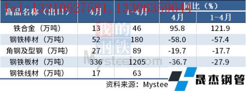4月,中國出口鋼鐵棒材52萬噸,同比下降58.0%;1-4月累計(jì)出口180萬噸,同比下降57.4%。其他出口情況如下表所示: