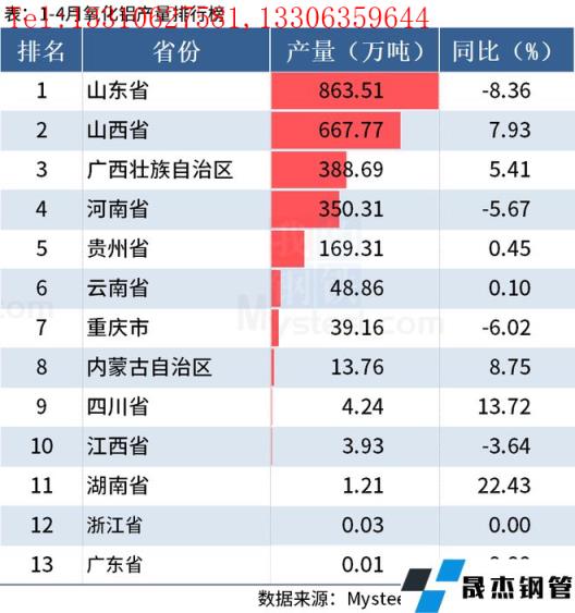 國(guó)家統(tǒng)計(jì)局?jǐn)?shù)據(jù)顯示,2022年4月全國(guó)氧化鋁產(chǎn)量682.0萬(wàn)噸,1-4月氧化鋁產(chǎn)量2550.8萬(wàn)噸。其中,4月山東、山西和廣西氧化鋁產(chǎn)量分別同比增長(zhǎng)1.35%、18.06%和10.79%。
