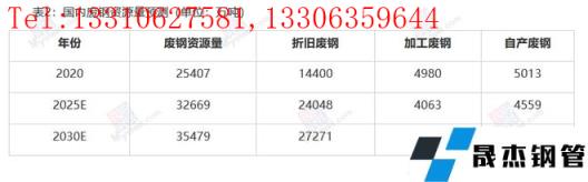 前面提及,國內(nèi)廢鋼的主要來源為自產(chǎn)廢鋼、加工廢鋼、折舊廢鋼。在廢鋼資源量預(yù)測中,自產(chǎn)廢鋼和加工廢鋼主要是根據(jù)未來粗鋼產(chǎn)量以及各主要厚壁無縫鋼管消費領(lǐng)域的用鋼量,通過一定的折損比例計算得出,折舊廢鋼資源量則需要充分考慮鋼鐵產(chǎn)品的生命周期,以及達到報廢期限后的實際報廢率及鋼鐵回收率。廢鋼資源量預(yù)測是根據(jù)此模型計算得出。