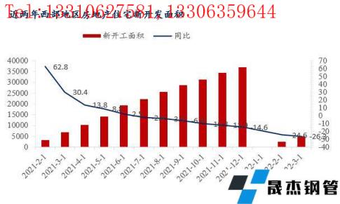 2022年以來,從上圖可以看出來,受住房不炒政策受影響,西北區(qū)域各省市房地產(chǎn)開發(fā)進(jìn)度緩慢,房地產(chǎn)開發(fā)企業(yè)投資完成額以及新開工面積同比均是小幅下降。分省市來看,陜西作為西北經(jīng)濟(jì)龍頭老大,房地產(chǎn)開發(fā)投資表現(xiàn)較好。2022年一季度,陜西省房地產(chǎn)開發(fā)企業(yè)完成投資674.03億元,同比增長5%,比1-2月提高1.8個(gè)百分點(diǎn)。而甘肅區(qū)域,一季度GDP同比增長5.3%,固定資產(chǎn)投資同比增長12.9%。其中,項(xiàng)目投資增長13.4%,房地產(chǎn)開發(fā)投資增長11.7%,商品房銷售面積下降10.7%。另外如分別是寧夏區(qū)域房地產(chǎn)開發(fā)投資增長增速為-1%。這在去年寧夏區(qū)域房地產(chǎn)開發(fā)投資增速為正數(shù),今年面臨較大下行壓力。整體來說,由于受疫情以及資金問題,工程項(xiàng)目進(jìn)度不如預(yù)期,厚壁無縫鋼管需求量同比減少,這也是前期西北區(qū)域建筑厚壁無縫鋼管消化緩慢以及庫存積壓原因。