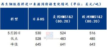 進入5月,日本東京制鐵廢鋼采購價格已經(jīng)歷了六連跌,5月份的關(guān)東鐵源出口招標會,又再現(xiàn)流標局面。據(jù)調(diào)研,截止5月20日,日本HS廢鋼到岸價在530美元/噸左右,距離4月初的高點大幅下降115美元/噸,近乎已回到年內(nèi)低點;截止5月20日,美國HMS1:2(80:20)廢鋼到岸價在524美元/噸,距離4月份的高點跌117美元/噸,離年內(nèi)低點約41美元/噸;截止5月20日,歐洲HMS1:2(80:20)廢鋼到岸價在516美元/噸,距離4月份的高點跌127美元/噸,離年內(nèi)低點約31美元/噸;當前歐美再生鋼鐵原料價格已接近年內(nèi)低點,日本再生鋼鐵原料的價格更是已回到了年初水平。