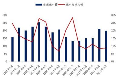 (1)進口供應(yīng):俄烏沖突下,烏克蘭海運出口清零,同時在中國球團進口量中,進口烏克蘭球團比例近兩年均值僅有16%,2021年二季度及2022年1-2月份,進口比例更是只有8%-11%。所以雖然烏克蘭海運出口被限,但對于中國國內(nèi)進口球團總量影響有限,環(huán)比當(dāng)前情況來看很難出現(xiàn)明顯下降趨勢。