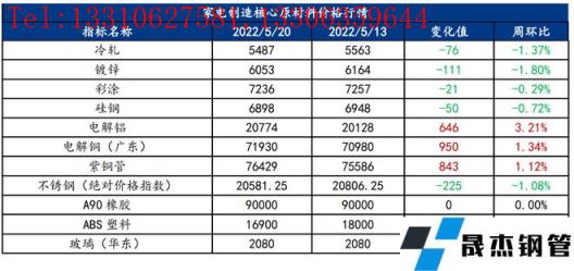 截止2022年5月20日,各原材料當(dāng)日即時(shí)價(jià)格以及價(jià)格周環(huán)比情況如下: