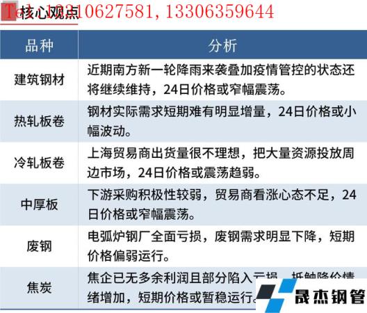 建筑厚壁無縫鋼管:5月23日,全國31個主要城市20mm三級抗震螺紋鋼均價4839元/噸,較上個交易日下跌10元/噸。短期來看,目前市場供應端同比持續(xù)低位,同時近期南方新一輪降雨來襲疊加疫情管控的狀態(tài)還將繼續(xù)維持,消費難有好轉(zhuǎn)預期。目前市場仍然處于供需雙弱的格局。短期市場關(guān)注點仍在于消費能否有效恢復以及雨季對于消費的影響,因此預計24日國內(nèi)建筑厚壁無縫鋼管現(xiàn)貨價格窄幅震蕩為主。