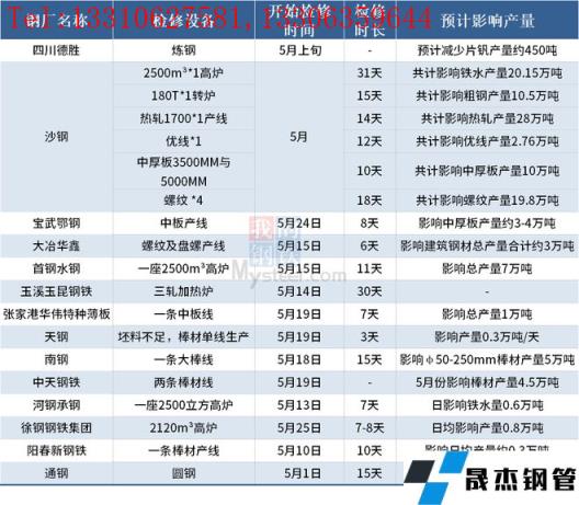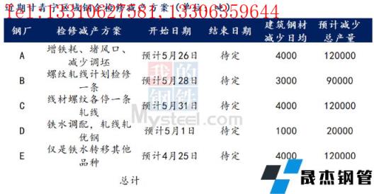 據(jù)不完全統(tǒng)計,截至5月25日,國內(nèi)14家無縫厚壁鋼管廠家發(fā)布檢修計劃。其中,徐鋼鋼鐵集團計劃25日對2120m3高爐進行為期7-8天停產(chǎn)檢修計劃,日均影響產(chǎn)量0.8萬噸。
