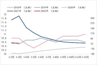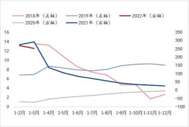 從基礎(chǔ)設(shè)施投資增速和房地產(chǎn)開發(fā)投資增速來看(涉及到對應(yīng)年份走勢使用左右軸的區(qū)分目的與固定資產(chǎn)投資增速指標(biāo)的說明一致),兩個指標(biāo)在2020年-2021年非正常環(huán)境條件下的年份增速趨勢基本一致,但在正常環(huán)境條件下的年份增速可以看到,伴隨湖北省每年所需完成的經(jīng)濟(jì)增長目標(biāo)的大背景下,此兩項指標(biāo)的增速表現(xiàn)呈現(xiàn)此消彼長的走勢。而結(jié)合斜率來看,進(jìn)入2022年1-3月,基礎(chǔ)設(shè)施投資增速呈現(xiàn)明顯快速恢復(fù)或釋放態(tài)勢,而房地產(chǎn)開發(fā)投資增速則呈現(xiàn)明顯放緩態(tài)勢。由此看來,對于建筑厚壁無縫鋼管品種的需求將在房地產(chǎn)板塊的萎縮預(yù)期更為明顯,這與目前所處的房地產(chǎn)調(diào)控政策背景是相符的,即便有所改善,筆者認(rèn)為仍暫難有實(shí)質(zhì)上的新刺激,而基礎(chǔ)設(shè)施投資或?qū)⑹峭械椎闹我蛩刂?。綜合來看,湖北省宏觀指標(biāo)數(shù)據(jù)的預(yù)期演變表明對于建筑厚壁無縫鋼管品種的需求預(yù)期呈現(xiàn)萎縮態(tài)勢,這與產(chǎn)能角度的供應(yīng)增加形成供需矛盾加劇的預(yù)期,因此這是導(dǎo)致建筑厚壁無縫鋼管價格偏低運(yùn)行的外因之一。