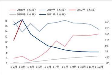 那么,先看一下宏觀數(shù)據(jù)反映的需求演變表現(xiàn),從近5年湖北省固定資產(chǎn)投資增速對比來看(說明:由于2020年因疫情影響,隨后兩年的總體增速呈現(xiàn)明顯落差波動,因此2018年-2019年的增速以左軸呈現(xiàn),2020年-2022年的增速表現(xiàn)以右軸呈現(xiàn),為了更好的呈現(xiàn)出增速表現(xiàn)進(jìn)行對比)。如圖所示,2020年1-12月隨著疫情緩解,湖北省固定資產(chǎn)投資增速逐漸恢復(fù),但基數(shù)下降后,2021年1-12月的增速呈現(xiàn)逐漸修正的態(tài)勢,時至2021年1-3月的增速基本恢復(fù)正常增速水平。從走勢上看,2021年1-3月湖北省固定資產(chǎn)投資增速仍高于2018年-2019年同期,但從斜率上看,維持平緩下降態(tài)勢,表明對應(yīng)的需求釋放或增量有限,整體或維持放緩的預(yù)期。