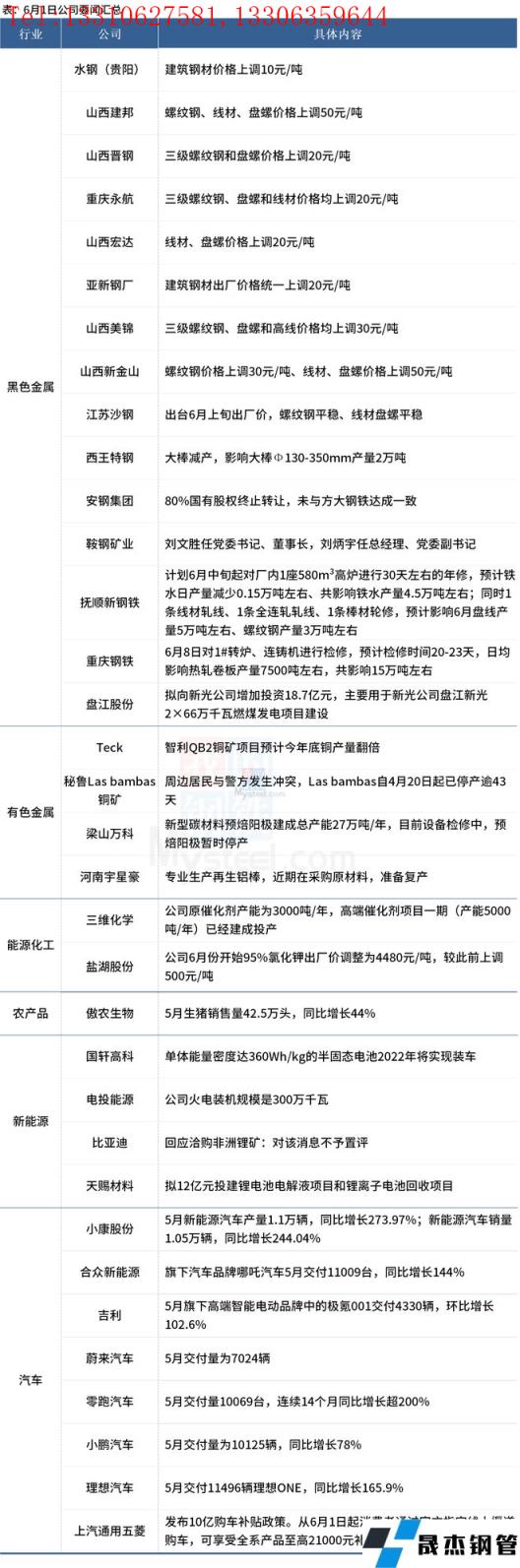 西王特鋼大棒減產(chǎn),影響大棒Φ130-350mm產(chǎn)量2萬噸;江蘇沙鋼出臺6月上旬出廠價,螺紋鋼平穩(wěn)、線材盤螺平穩(wěn);Teck智利QB2銅礦項目預(yù)計今年底銅產(chǎn)量翻倍;天賜材料擬12億元投建鋰電池電解液項目和鋰離子電池回收項目。