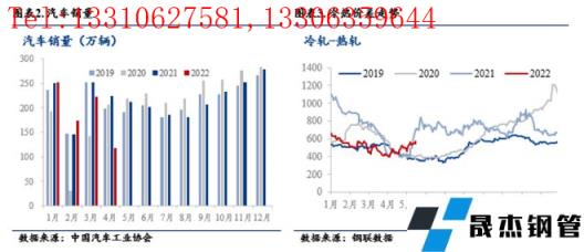 汽車(chē)行業(yè)作為我國(guó)厚壁無(wú)縫鋼管消費(fèi)重要的下游行業(yè),其厚壁無(wú)縫鋼管用量約占汽車(chē)總重量的70%左右。整車(chē)制造過(guò)程中,轎車(chē)單車(chē)厚壁無(wú)縫鋼管耗量1噸左右,其中,冷軋是汽車(chē)厚壁無(wú)縫鋼管消費(fèi)“主力”,約占汽車(chē)厚壁無(wú)縫鋼管消費(fèi)的30%,未來(lái)汽車(chē)需求增量將直接影響冷軋價(jià)格走勢(shì)。一般而言,汽車(chē)產(chǎn)銷(xiāo)旺季在下半年開(kāi)啟,尤其在第四季度達(dá)到頂峰,隨著汽車(chē)消費(fèi)回升,冷熱價(jià)差呈現(xiàn)規(guī)律性擴(kuò)大。2022年以來(lái),受疫情影響,汽車(chē)生產(chǎn)和消費(fèi)受到抑制,尤其是4月份,國(guó)內(nèi)汽車(chē)銷(xiāo)量同比、環(huán)比降幅均超過(guò)40%。本次汽車(chē)購(gòu)置稅減半政策力度大,涉及范圍廣,對(duì)刺激市場(chǎng)消費(fèi)、提振消費(fèi)者信心起到重要作用,預(yù)計(jì)下半年汽車(chē)產(chǎn)銷(xiāo)將得到有力回補(bǔ),7-8月汽車(chē)產(chǎn)銷(xiāo)或呈現(xiàn)“淡季不淡”的特征,冷軋價(jià)格將得到提振,預(yù)計(jì)下半年冷熱價(jià)差或長(zhǎng)期居于高位。
