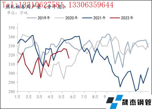6月份部分無縫厚壁鋼管廠家有檢修計劃,周產量小幅減少10萬噸左右至316-318萬噸左右,環(huán)比減少1.25%。