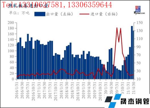 就目前來看,近期熱卷出口量暴增主要是因為2至4月份大批量出口單簽訂,并開始陸續(xù)發(fā)貨,因此4-6月份出口量或將繼續(xù)攀升,但從近期出口市場訂單簽訂情況來看,我國熱軋板卷出口或將在7月份開始減量。