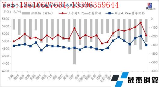 圖6:國內25個主要地區(qū)熱軋板卷市場價格及月度漲跌幅