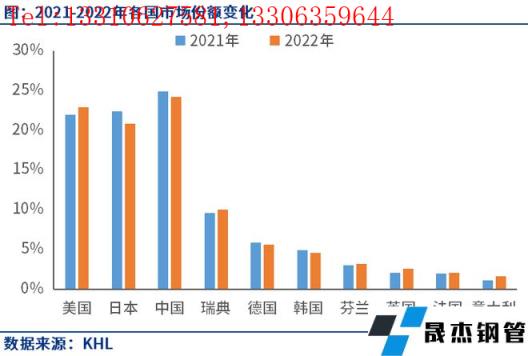 分國(guó)別來(lái)看,2022年全球各國(guó)市場(chǎng)份額排名前三的國(guó)家分別是中國(guó)、美國(guó)、日本,2022年這三個(gè)國(guó)家市場(chǎng)份額分別為24.2%、22.9%、20.8%,三個(gè)國(guó)家在全球市場(chǎng)份額已經(jīng)達(dá)到了67.9%。其中,中國(guó)和日本2022年市場(chǎng)份額分別下降0.7個(gè)百分點(diǎn)、1.6個(gè)百分點(diǎn),美國(guó)2022年市場(chǎng)份額提高1個(gè)百分點(diǎn)。
