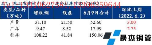 6月2日-8日本周東三省建筑厚壁無縫鋼管產(chǎn)量合計(jì)52.60萬噸,較上周增3萬噸;廠庫合計(jì)17.99萬噸,較上周增2.75萬噸;總社庫150.06萬噸,較上周增2.99萬噸。