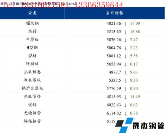 6月10日普鋼絕對(duì)價(jià)格指數(shù)變化:綜合指數(shù)5058.29,下跌12.4;螺紋鋼指數(shù)4821.36,下跌17.99;線材指數(shù)5213.65,下跌16.88;熱軋板卷指數(shù)4877.7,下跌9.63;冷軋板卷指數(shù)5337.5,下跌9.3;中厚板指數(shù)5076.26,下跌7.47。