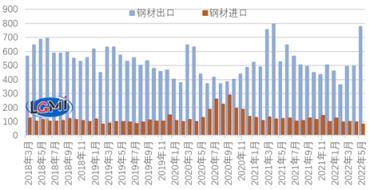 圖1 2018-2022年月度無縫鋼管 厚壁鋼管進(jìn)出口走勢