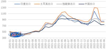 5月份,海外無縫鋼管 厚壁鋼管市場供需形勢得以改善,主要出口國家大幅下調(diào)無縫鋼管 厚壁鋼管出口報(bào)價(jià)。進(jìn)入6月份,印度加征出口關(guān)稅一定程度提振了熱卷價(jià)格,各國出口報(bào)價(jià)基本穩(wěn)定,云商平臺監(jiān)測數(shù)據(jù)顯示,2022年6月8日,印度、土耳其、獨(dú)聯(lián)體和中國熱軋卷板出口報(bào)價(jià)(FOB)分別為850美元/噸、820美元/噸、740美元/噸和740美元/噸,與5月底基本持平。