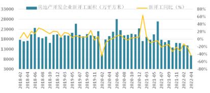1-4月份,房屋新開工面積39739萬平方米,同比下降26.3%;從單月來看,自去年4月份開始,新開工面積持續(xù)負(fù)增長,今年4月份同比降幅由上月的22.2%擴(kuò)大至44.2%,新開工下行明顯加快,對后期施工和行業(yè)的投資形成制約。