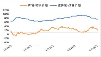 6月焊管較帶鋼價(jià)差由月初收至零軸后重新走擴(kuò),目前管廠(chǎng)廠(chǎng)內(nèi)原料輪換周期拉長(zhǎng)至15天左右,結(jié)算周期內(nèi)焊管生產(chǎn)利潤(rùn)平均虧損139元,架子管平均虧損129元;鍍鋅管較焊管價(jià)差擴(kuò)大96元,綜合生產(chǎn)利潤(rùn)有所改善,但整體仍處虧損邊緣。