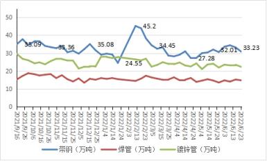 焊鍍管廠(chǎng)產(chǎn)能利用率靈活下降。6月在統(tǒng)計(jì)管廠(chǎng)總產(chǎn)量145.46萬(wàn)噸,月比增產(chǎn)7.51萬(wàn)噸,月中下旬產(chǎn)能利用率逐步下降至60%左右,周末倒班減產(chǎn),整體在統(tǒng)計(jì)管廠(chǎng)影響產(chǎn)量在14萬(wàn)噸上下,占總產(chǎn)量的22.7%。截至6月23日,天津唐山邯鄲主流管廠(chǎng)廠(chǎng)內(nèi)總體庫(kù)存68.01萬(wàn)噸,比上月增1.86萬(wàn)噸。進(jìn)入6月,疫情形勢(shì)好轉(zhuǎn),主導(dǎo)管廠(chǎng)協(xié)議原料陸續(xù)到庫(kù),但行情突降,生產(chǎn)利潤(rùn)進(jìn)入洼地,管廠(chǎng)快速調(diào)整產(chǎn)能應(yīng)對(duì),引導(dǎo)供需向再平衡過(guò)渡,整體來(lái)看,博弈階段仍存一定壓力(見(jiàn)圖4)。