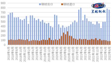 海關(guān)總署發(fā)布數(shù)據(jù)顯示,2022年6月份,我國出口厚壁鋼管755.7萬噸,同比增長17.0%;1-6月份累計(jì)出口厚壁鋼管3346.1萬噸,同比下降10.5%。6月份,我國進(jìn)口厚壁鋼管79.1萬噸,同比下降36.8%;1-6月累計(jì)進(jìn)口厚壁鋼管577.1萬噸,同比下降21.5%(詳見圖1)。