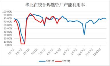 焊鍍管廠產(chǎn)能走勢(shì)與往年趨同,但更具靈活性。1月中旬左右冬奧會(huì)管控供應(yīng)端消息發(fā)散,停產(chǎn)停工晚于往年,南方部分管廠產(chǎn)線在28日-29日左右停工。焊管尤其是鍍鋅管春節(jié)后產(chǎn)量恢復(fù)慢于往年,2月中旬生產(chǎn)管控有所放松。進(jìn)入3月,河北多地連續(xù)兩次封控,長(zhǎng)達(dá)51天,管廠向外發(fā)運(yùn)運(yùn)力較低,焊鍍管生產(chǎn)企業(yè)產(chǎn)能利用率最高下降了32.55個(gè)百分點(diǎn)。其他時(shí)間管廠整體開(kāi)工率基本靈活把控在75%左右,上半年在統(tǒng)計(jì)管廠平均產(chǎn)能利用率69.97%,較去年下降5.87個(gè)百分點(diǎn)。供需基本面雖有一定改善,但今年各品牌資源競(jìng)爭(zhēng)激烈,下半年淡季階段管廠多是按需靈活控產(chǎn),整體產(chǎn)能相較平穩(wěn),利用套期保值等工具規(guī)避風(fēng)險(xiǎn),從而實(shí)現(xiàn)利潤(rùn)回歸。