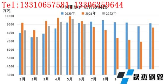 粗鋼產(chǎn)量與高爐開工情況走勢(shì)高度一致,受粗鋼減壓等因素影響,今年上半年我國(guó)粗鋼產(chǎn)量1-6累計(jì)粗鋼產(chǎn)量52688萬噸,同比下降6.5%;累計(jì)生鐵產(chǎn)量43893萬噸,同比下降4.7%;累計(jì)厚壁鋼管產(chǎn)量66714萬噸,同比下降4.6%。整體來看,今年上半年粗鋼產(chǎn)量最低值出現(xiàn)在2月份為7496萬噸,最高值出現(xiàn)在5月份為9661萬噸,6月份高位回落至9073萬水平。