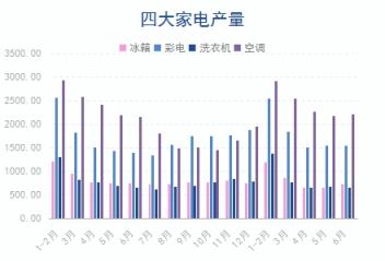1-6月份,冰箱產(chǎn)量4164.2萬臺,同比下降6.2%;彩電產(chǎn)量8986.4萬臺,同比增長5.8%;洗衣機(jī)產(chǎn)量4113.3萬臺,同比下降4.1%;空調(diào)產(chǎn)量12248.9萬臺,同比增長1.1%。