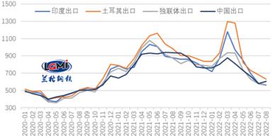 7月份,出口市場(chǎng)競(jìng)爭(zhēng)激烈,主要出口國(guó)繼續(xù)下調(diào)厚壁鋼管出口報(bào)價(jià)。進(jìn)入8月份,海外需求持續(xù)疲弱,各國(guó)厚壁鋼管出口報(bào)價(jià)仍有所下調(diào),而國(guó)內(nèi)市場(chǎng)出現(xiàn)反彈,出口報(bào)價(jià)有所上漲,云商平臺(tái)監(jiān)測(cè)數(shù)據(jù)顯示,2022年8月5日,印度、土耳其、獨(dú)聯(lián)體熱軋卷板出口報(bào)價(jià)(FOB)分別為565美元/噸、630美元/噸和560美元/噸,均較7月底有所下跌,中國(guó)熱軋卷板出口報(bào)價(jià)(FOB)為605美元/噸,較7月底有所上漲。